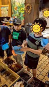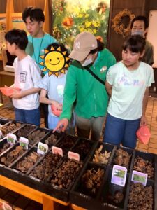 実際の木の実や加工された材料がたくさんあって、みんなどれにしようか考えながら選んでいます!